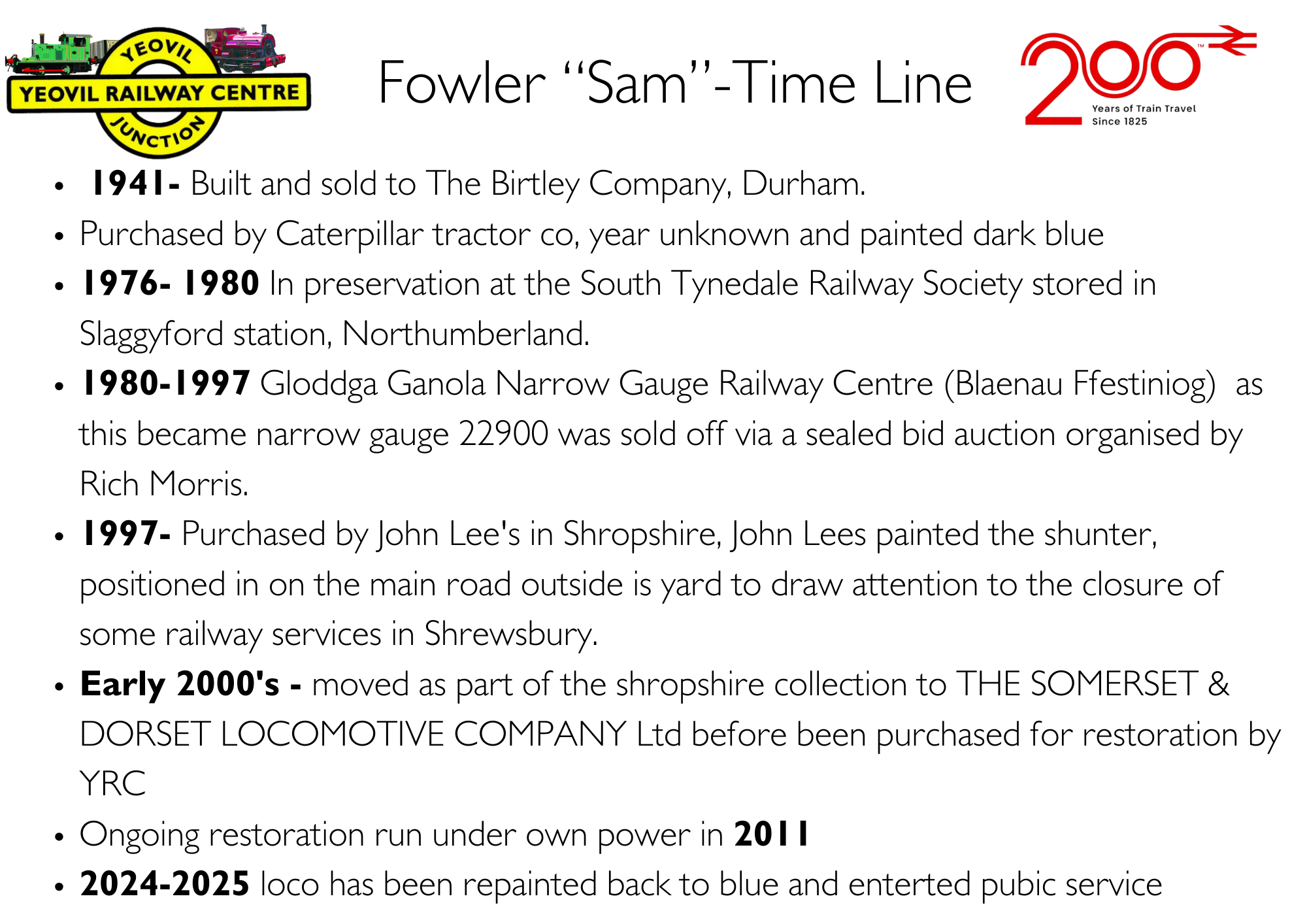 The locomotive was delivered to Birtley Co. Ltd in County Durham on 29 March 1941 spending its life with Caterpillar tractor co tractors before preservation in the 1970's. After the majority of the restoration work was carried out by YRC it was Named 'Sam' after a railway dog.