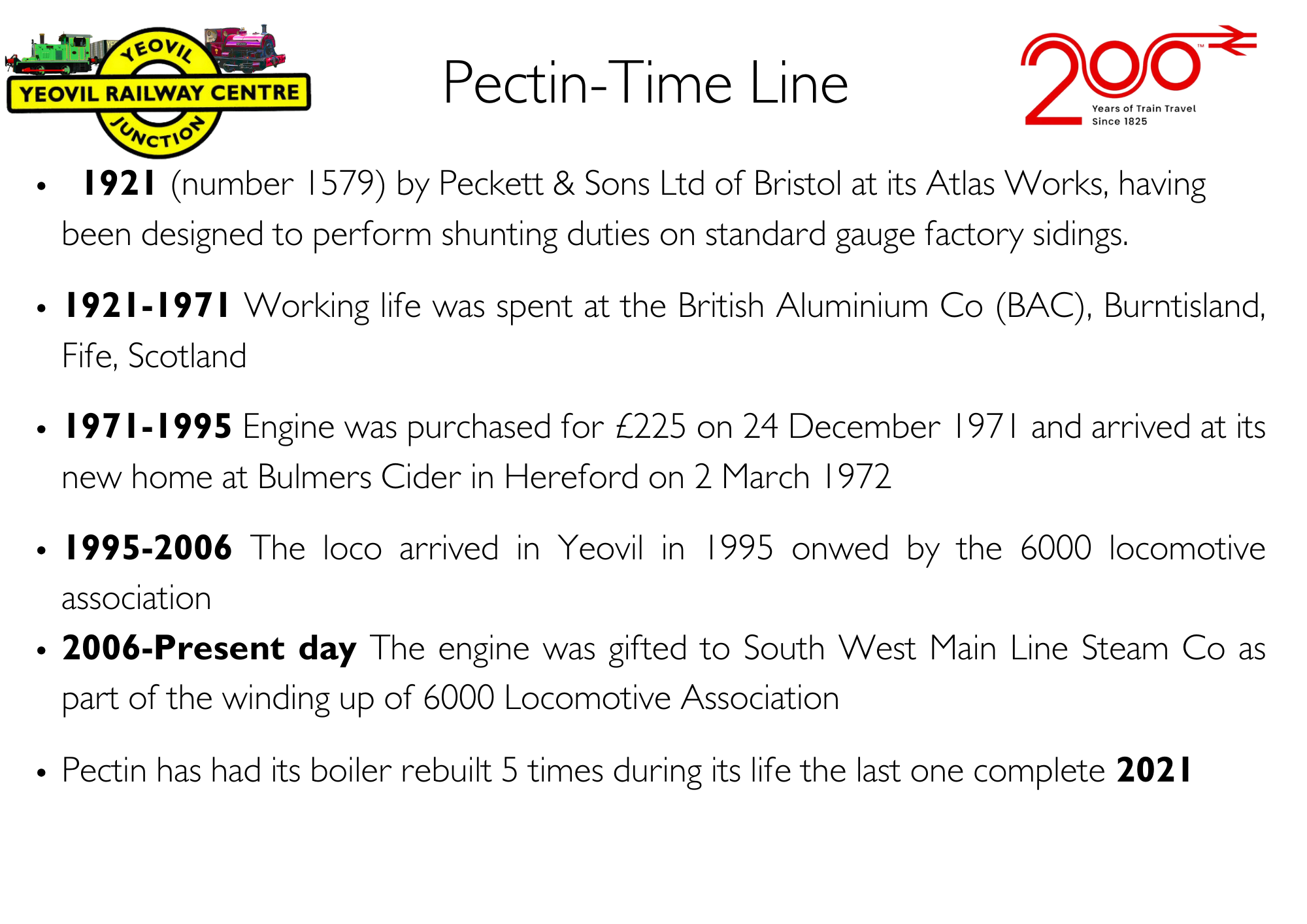 'PECTIN' was built in 1921 (number 1579) by Peckett & Sons Ltd of Bristol at its Atlas Works, having been designed to perform shunting duties on standard gauge factory sidings. Its working life was spent at the British Aluminium Co (BAC), Burntisland, Fife, Scotland. The engine was purchased for £225 on 24 December 1971 and arrived at its new home at Bulmers Cider in Hereford on 2 March 1972. The loco arrived in Yeovil in 1995 having had its third boiler overhaul costing some £15,000.