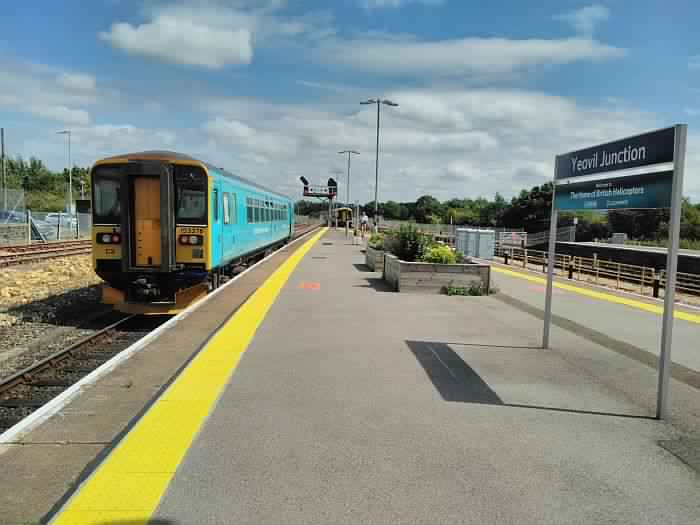Note the new signs promoting 'The Home of British Helicopters'. ex-East Midlands DMU 153376 visits Yeovil Junction