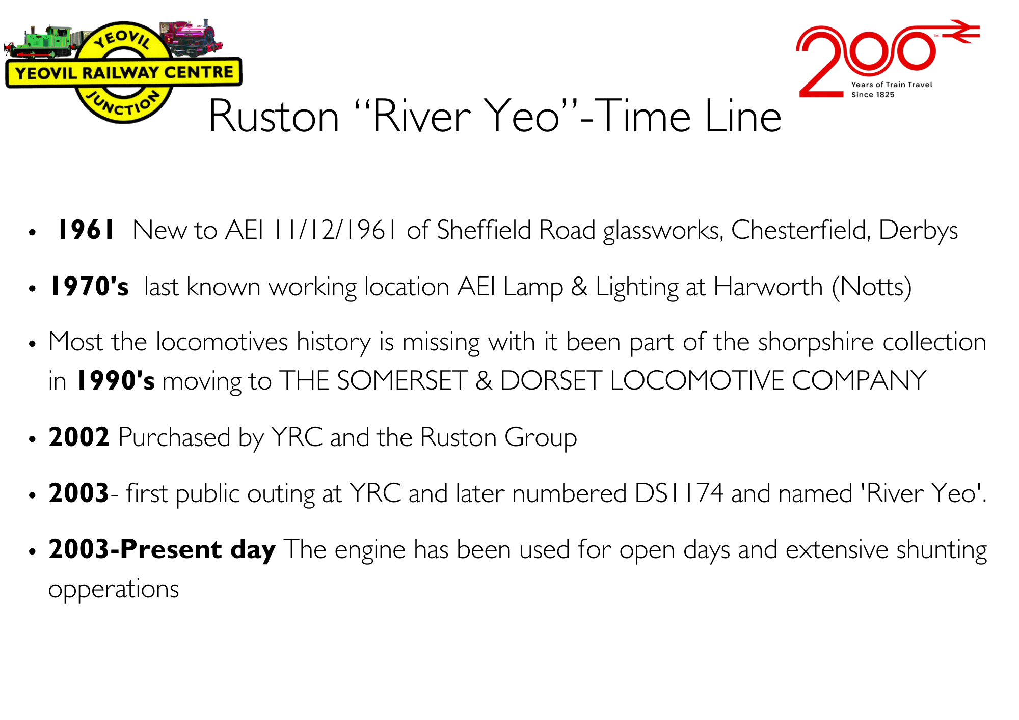 Engine Type 48DS with 48 hp Ruston 4YC engine. Works number 458959 and engine number 460158. New to AEI 11/12/1961 of Sheffield Road glassworks, Chesterfield, Derbys with a last known working location AEI Lamp & Lighting at Harworth (Notts). Some 130 locos of this class were built before this example and only 6 afterwards as demand for locos with low power and traction effort had dwindled. The engine has been numbered DS1174 and named 'River Yeo'.