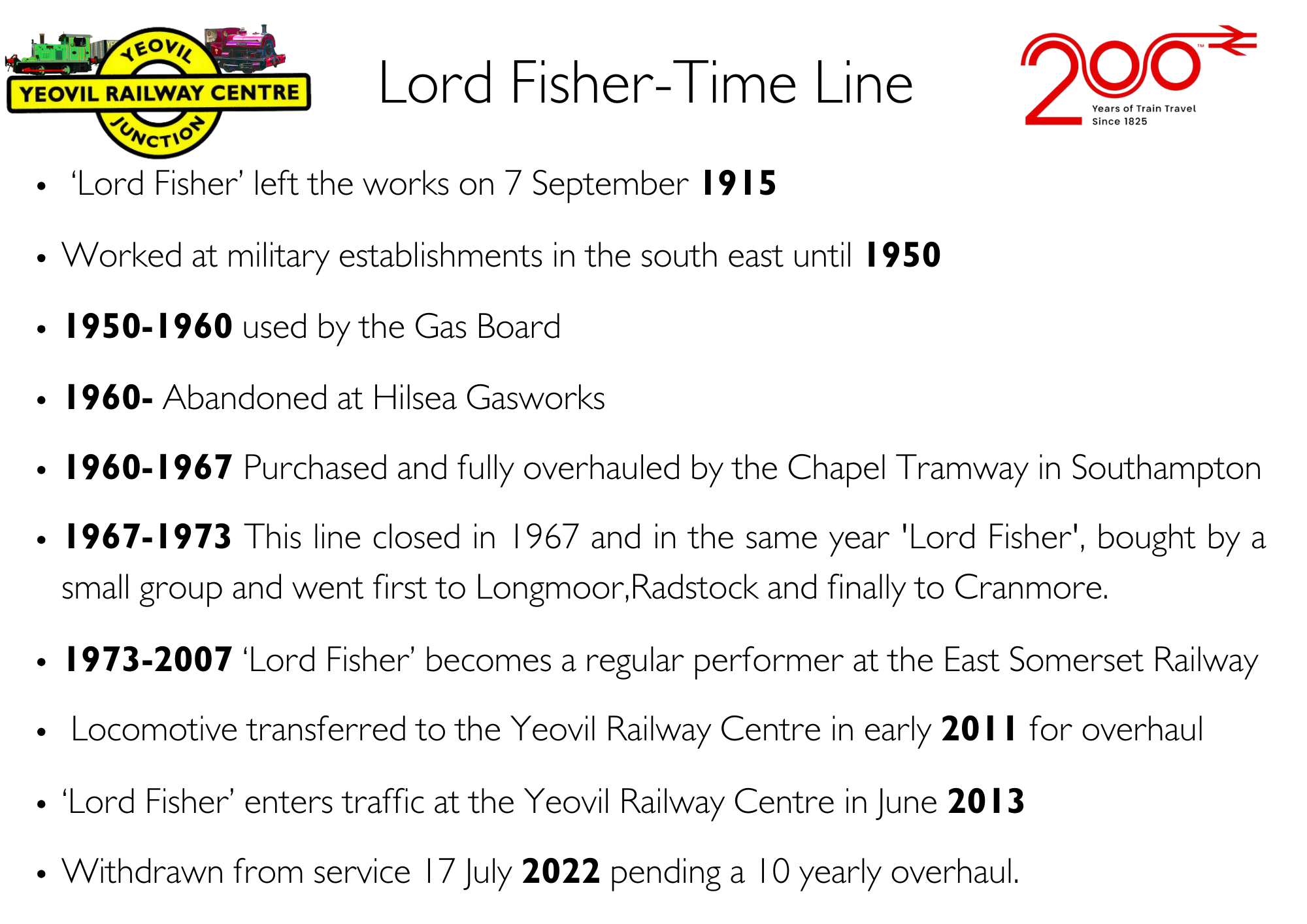 ‘Lord Fisher’ left the works on 7 September 1915 and worked at military establishments in the south east until being purchased by the Gas Board around 1950. It ended up dumped at Hilsea Gasworks in about 1960 when it was purchased and fully overhauled by the Chapel Tramway in Southampton, an industrial line near to the docks. This line closed in 1967 and in the same year 'Lord Fisher', still in working order, was bought by a small group and went first to Longmoor, then to Radstock and finally in 1973 to Cranmore. By this time Barry Buckfield was the sole owner. During the early years of the East Somerset Railway, it was the mainstay, operating brakevan trips and being available for shunting. It was still being used for most shunting up to around 1997 when small diesel shunters were introduced at the East Somerset Railway, which took over most this work.