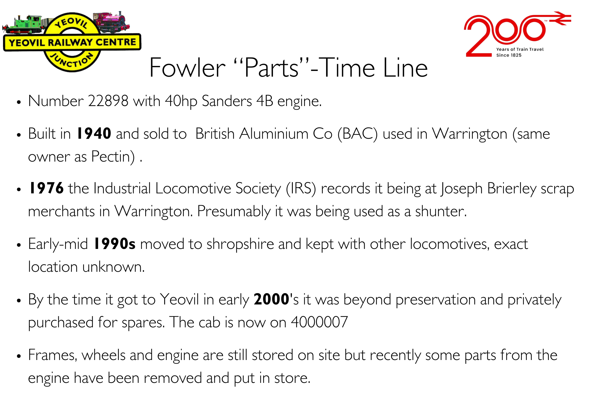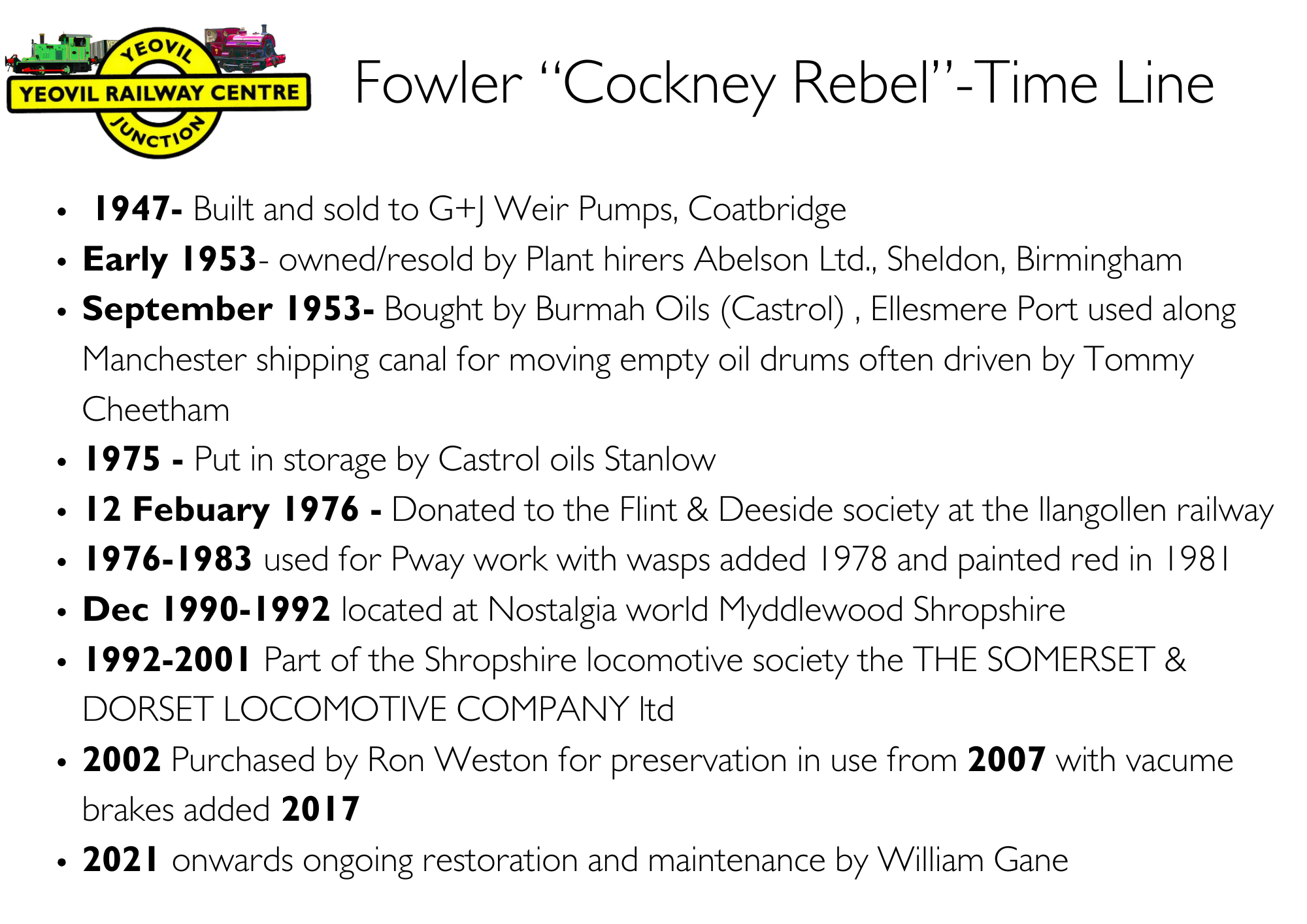 Built by John Fowler & Co and delivered new to Weir Pumps at Coatbridge, Scotland where it stayed for 6 years and then moved to Castrol Oils at Ellesmere Port for another 23 years. Later gifted by Burmah Oil to the Llangollen Railway for use on their new railway. The locomotive was used extensively with the permanent way and named “Burmah” due to its previous career. After being stored the engine became part of the Shropshire Collection of locomotives being stored in a field. The Collection was purchased by Somerset & Dorset Locomotive Company Limited and was amongst a number which moved to storage at Yeovil Junction (upside sidings). Purchased for preservation and significantly restored by Ron Weston. From 2021 the locomotive is now looked after by William Gane and continues to be in public use.